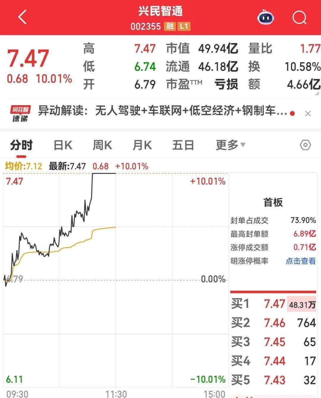 兴民智通(002355)早盘获48.31万手买单封板,封单资金达到3.61亿元,公司在投资者问答平台上表示,公司与北汽集团在自动驾驶领域围绕技术攻关、平台协同与场景创新展开:联合开发5G及车载卫星通信技术,攻关多域融合控制器平台,深化北斗高精度定位技术的应用,全方位支撑自动驾驶功能落地。